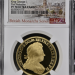 イギリス2022年ジョージ1世100ポンド金貨 NGC PF70 UCAMです。地金コインとまではいきませんが金価格がもう少し上がると地金価格になります。ブリティッシュモナークシリーズと銘打って発...