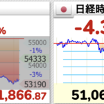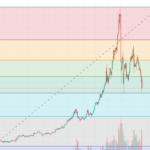 日本の株が先週終値より2300円下げています。仮想通貨も下げています。金銀は少し踏ん張っています。日本株は青い実線のサポートラインを確実に切り、下げの様相をさらに強くしています。フィボナッチでは0...
