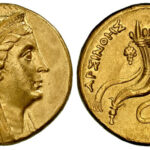 古代ギリシャ エジプト紀元前253年 アルシノエ オクタドラクマ金貨NGC AU 5/5 3/5をご紹介します。プトレマイオス朝の女王として君臨し実質的な統治者と、言われています。女傑と言っても過言...