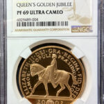 イギリス2002年ゴールデンジュビリー5ポンドPF69UCAMが入荷しました。この金貨の特徴はエリザベスの肖像がこのコイン唯一のもので他の5ポンドとは違った面を持っていることです。アーマー/鎧をつ...