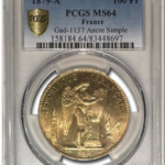 フランス1879年エンジェル100フラン金貨 PCGS MS64をご紹介します。発行枚数が多く実際に使われていたので状態の良いものがありません。まだ裸のものも多くありますし、それらは鑑定に出しても良いグレードは期待できません。この個体はPCGS MS64と今入手できるものの中では最高のものだと思...
