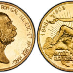 オーストリア1908年100コロナ金貨 雲上の女神 PCGS PR62CAMです。オーストリア皇帝フランツヨーゼフの右向きの肖像画大きく描かれています。また半面は女神が雲に乗って月桂冠を手渡しているデザインです。そしてこの女神がヨーゼフが恋い焦がれていたシシィ/エリーザベトであった、と思わせる絵柄...