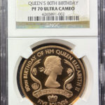 イギリス領ガーンジー2006年エリザベス80歳5ポンド金貨 NGC PF70 UCAM お客様分が入荷しました。最も若いエリザベスの右向きの肖像が描かれているコインはほとんどありません。数日前に紹介しました、エリザベス戴冠シリーズの第1肖像くらいでそのほかにはこのコインしかないほどです。ヤングヤ...