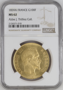 フランス1859年ナポレオン3世100フラン金貨 無冠NGC MS62です。