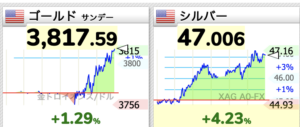 金銀は本日も猛進中、最高値の3,817ドル、銀も47ドルを超えました。