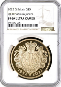 写真はイギリス2022年発行のプラチナジュビリー5ポンド金貨です。