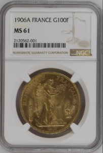 フランス1906年エンジェル100フラン金貨 NGC MS61をご紹介します。
