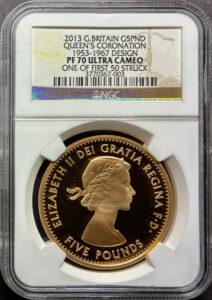 イギリス2013年エリザベス戴冠1953-1967肖像5ポンド金貨NGCPF70UCAM お客様分が入荷しました。エリザベスの最も若い時期の肖像が描かれているこの5ポンド金貨は最も入手しにくい金貨でもあります。