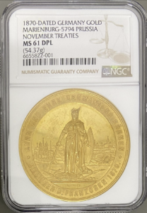 ドイツ プロイセン1870年16ダカット大型ゴールドメダル NGC MS61 DPLを委託でお預かりしました。
