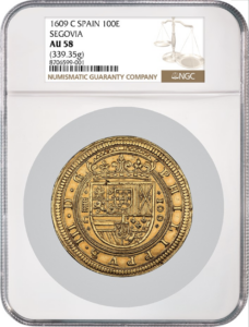 スペイン セゴビア1609年100エスクード金貨 NGC AU58 が出品されます。