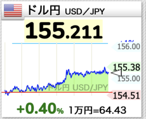 外国為替ではドル/円が155.3円、ユーロ/円 180円、ポンド/円 204円と日本円は急激な円安に向かっています。