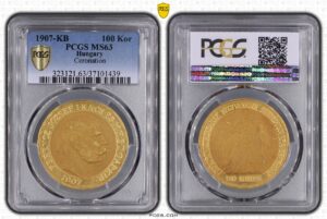 今日はその1枚目、 ハンガリー1907年100コロナ金貨 PCGS MS63です。