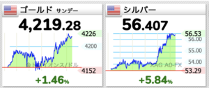 前日比で金は1.46%、銀はなんと5.84%、約6%も上昇しています。