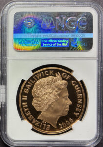 イギリス領ガーンジー2006年エリザベス80歳5ポンド金貨 NGC PF70 UCAM お客様分が入荷しました。最も若いエリザベスの右向きの肖像が描かれているコインはほとんどありません。