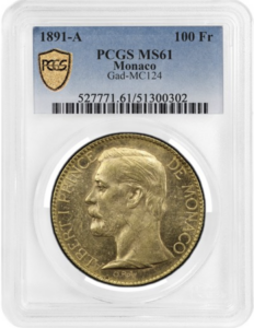 モナコ1891年アルベルト1世100フラン金貨PCGS MS61