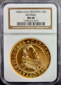 リヒテンシュタイン1616年/1966年カール1世10ダカット金貨NGC MS68が入荷しました。