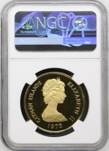 イギリス領ケイマン諸島1975年ファイブクイーンズ100ドル金貨 NGC PF69 UCAMをご紹介します。