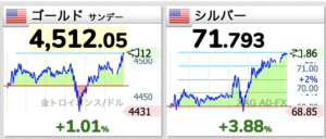 銀は71.8ドルと過去最高値をさらに更新、金も4,512ドルと過去最高値を更新中
