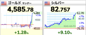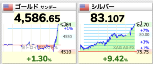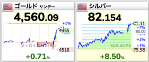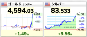 金銀が恐ろしいことになっています。 2026.01.12 金貨ブログNews 1月12日、朝から金銀が急上昇しています。チャートは1時間ほどの間の動きです。金は過去最高値の4554ドルを軽く越え、4594ドルに銀も銀も一瞬つけた83.9ドルに近づいています。 前の記事へ« BASEL 3によってゴールドは再びティア1マネーへと格上げされた 次の記事へイギリス1847年ゴシッククラウン銀貨NGC PF60 プレーンエッジ »