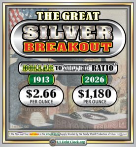 The Great Silver Breakout/大いなる銀の大爆発と題した、US DEBT CLOCK・アメリカ借金時計は110年前の銀1オンス2.66ドルと2026年の1,180ドルを示しています。