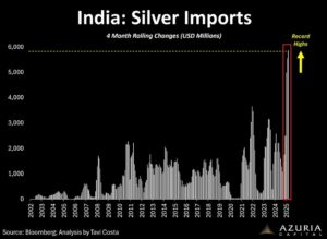 インドの銀輸入は過去4か月で記録的な約59億ドルに急増した。