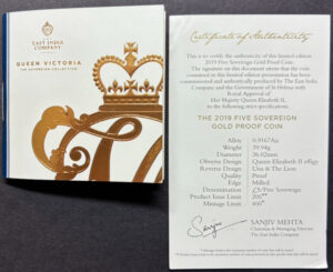 元箱と発行証明書つきの美しい5ポンド金貨です。