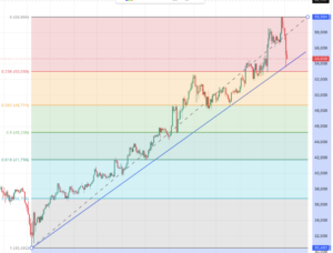フィボナッチ(黄金比)で見ると、最初の関門-38.2%は48622円、さらに下げると-50%は45238円、そして次の関門は-61.8%、41756円と出ています。世界的に株安が起こっていて韓国も大きく下げ、アメリカも下げています。