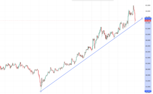 青いラインは昨年4月30442円の底値と12月のサポートを結んだ線ですが、昨日53500円まで下げました。